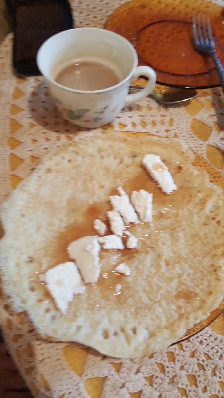Then, coffee and polichinka (between a crepe and a pancake) with feta and honey from pra diado’s (great grandfather’s) bees.
